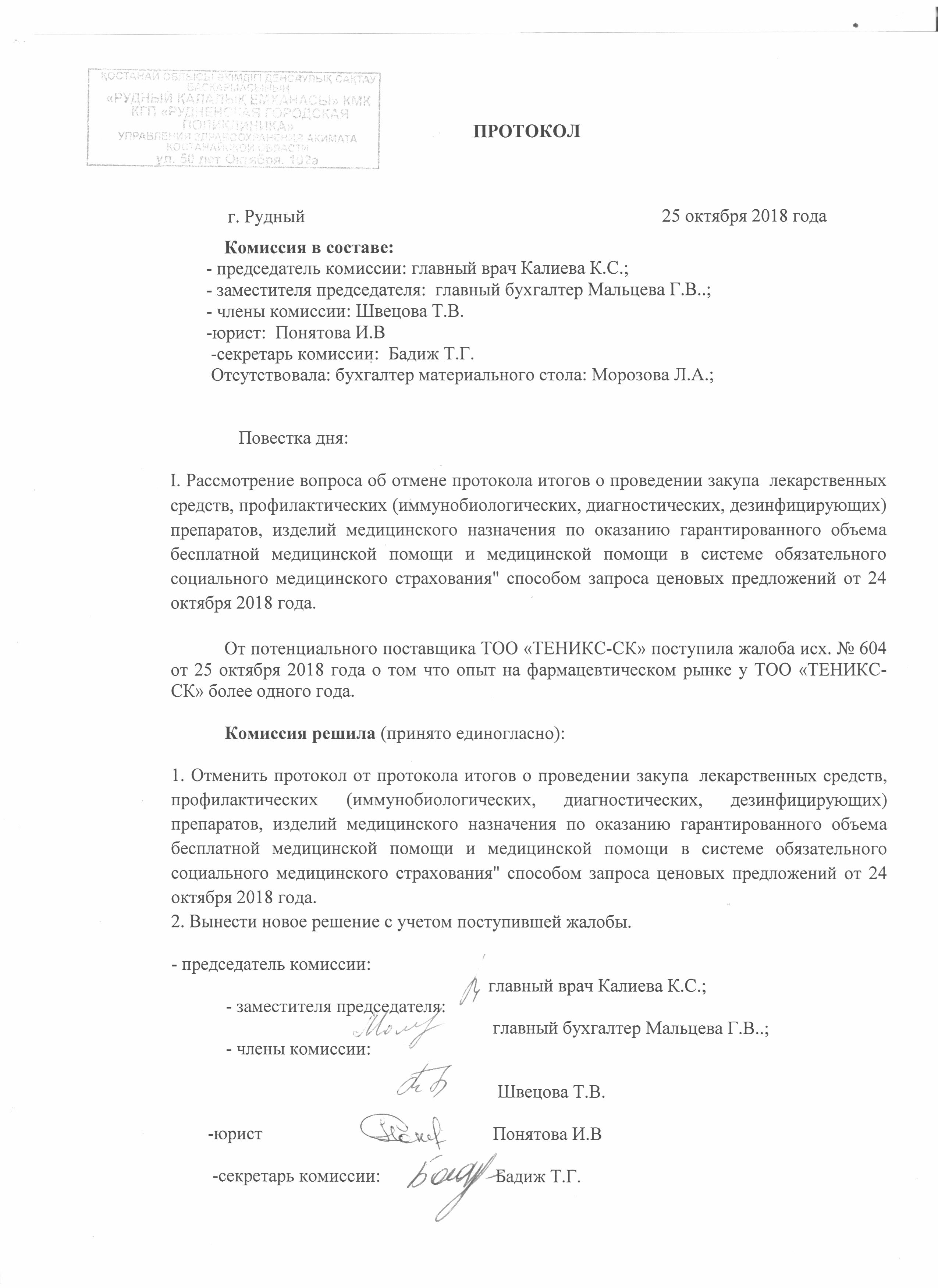Протокол - уведомление об отмене протокола итогов по закупу ИМН октябрь 2018 год.